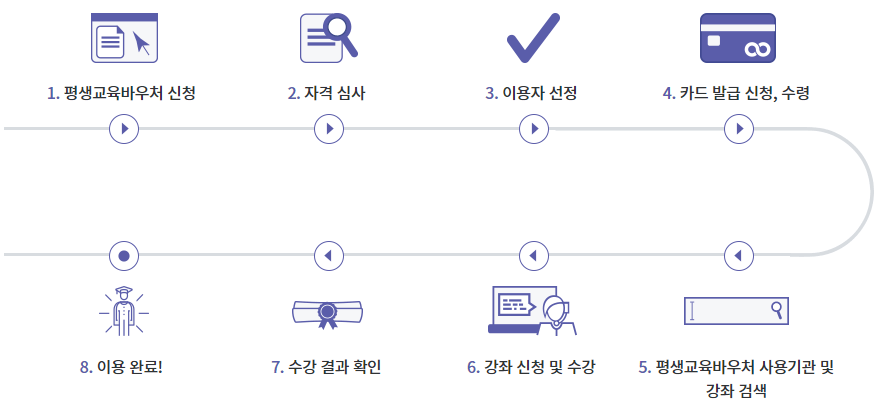 - 사용처 : 평생교육 바우처 사용기관으로 등록된 기관에서 교재비, 수강료로 사용가능